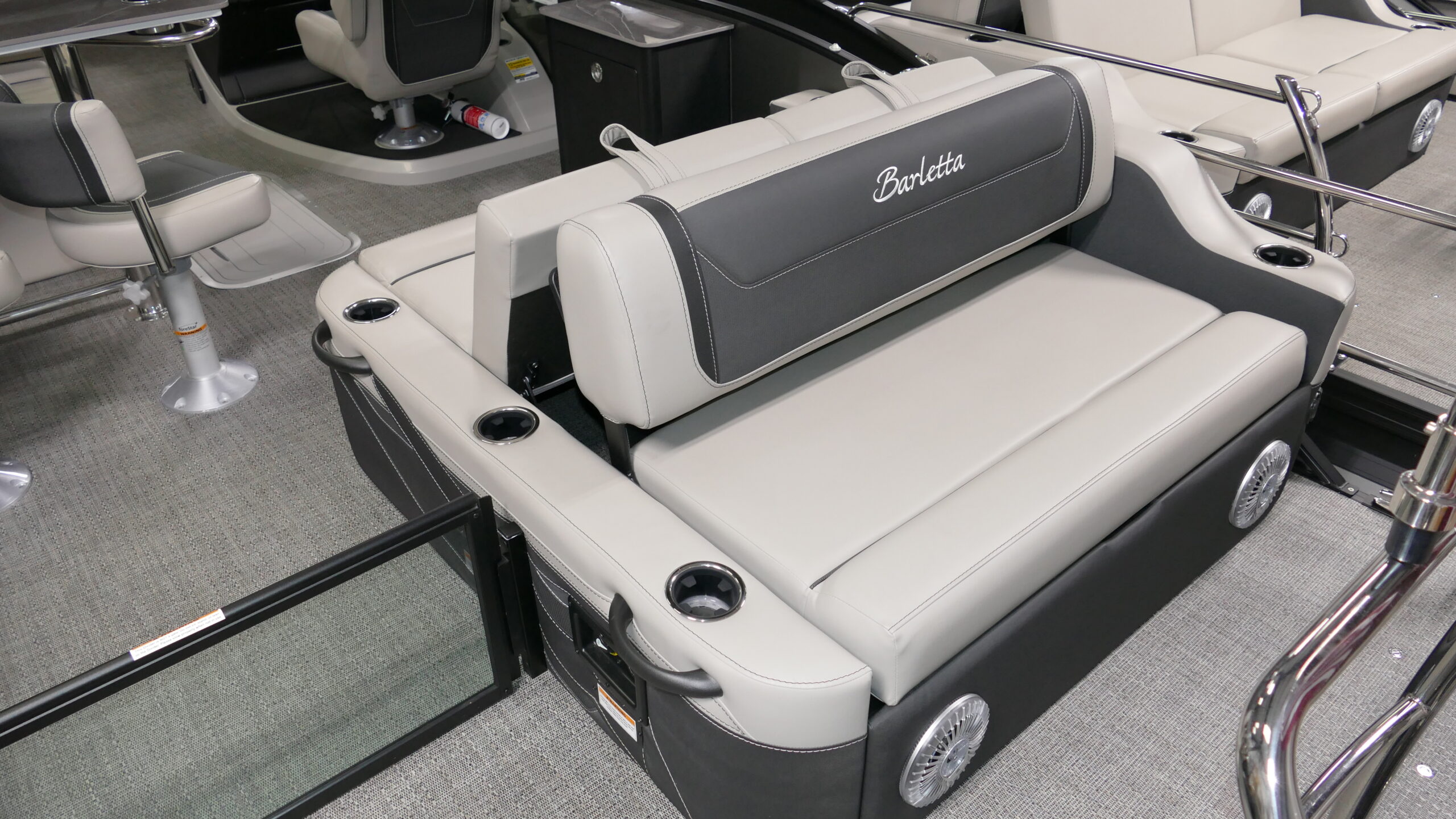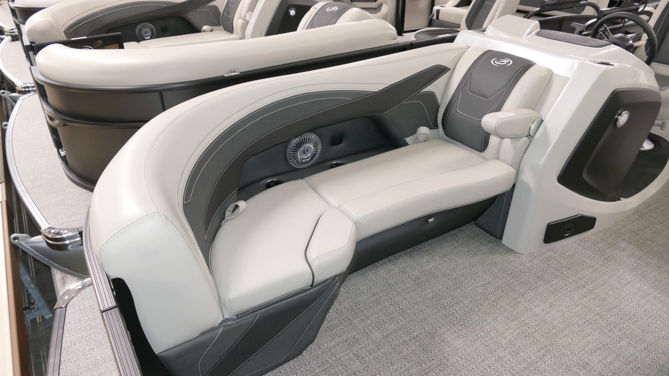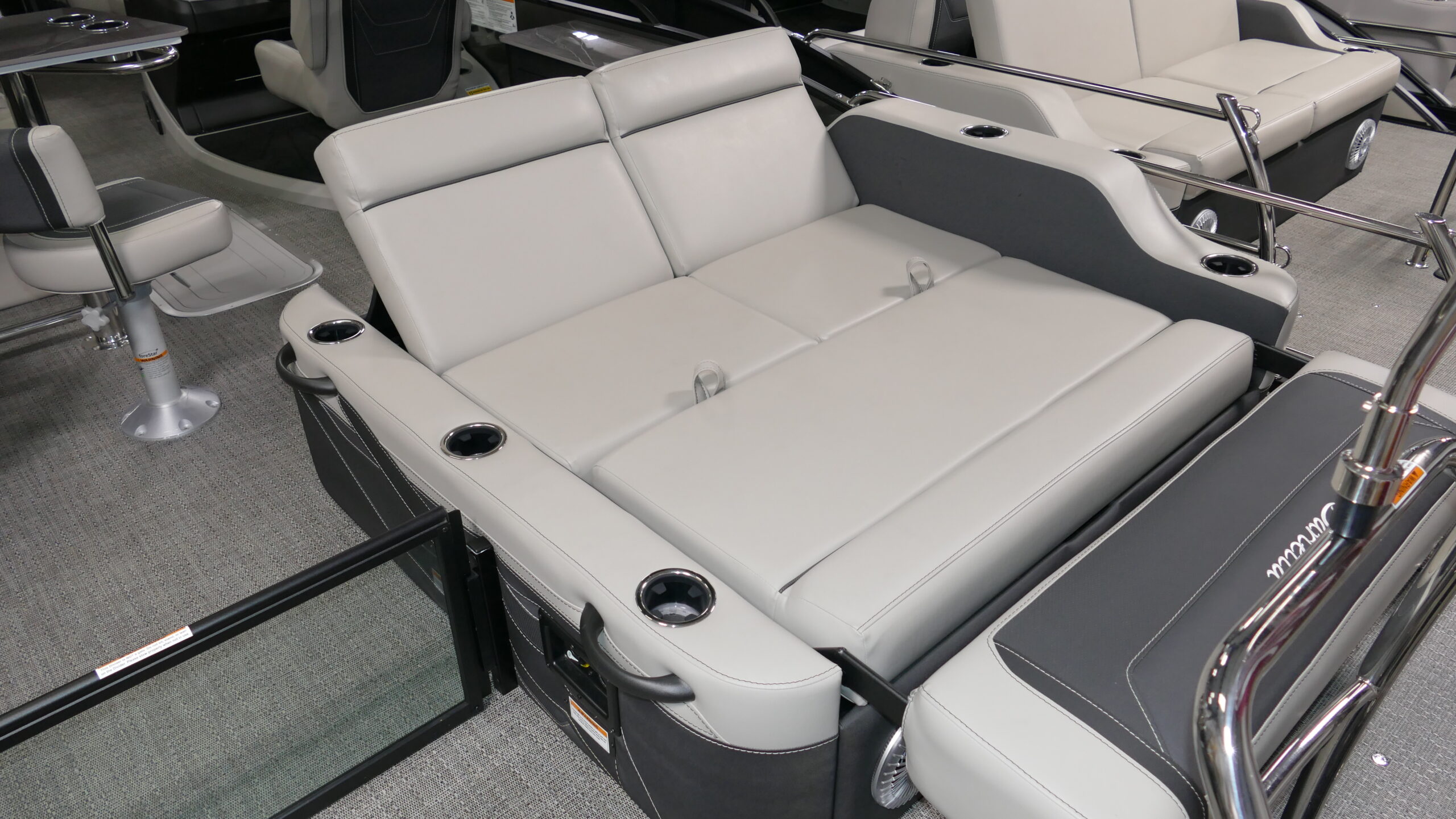 The highlight of the Ultra-Entertainer floorplan is the versatile high-top table accompanied by two upholstered swivel stools with additional multi-function bench seating perfect for hosting family and friends of all ages. Moving to the stern of the boat you will find the one-of-a-kind Ultra-Lounge featuring 5 different seating positions. To round-off this floorplan, you will find the standard chaise-lounge seating in the bow designed for comforting lounging and extra seating.